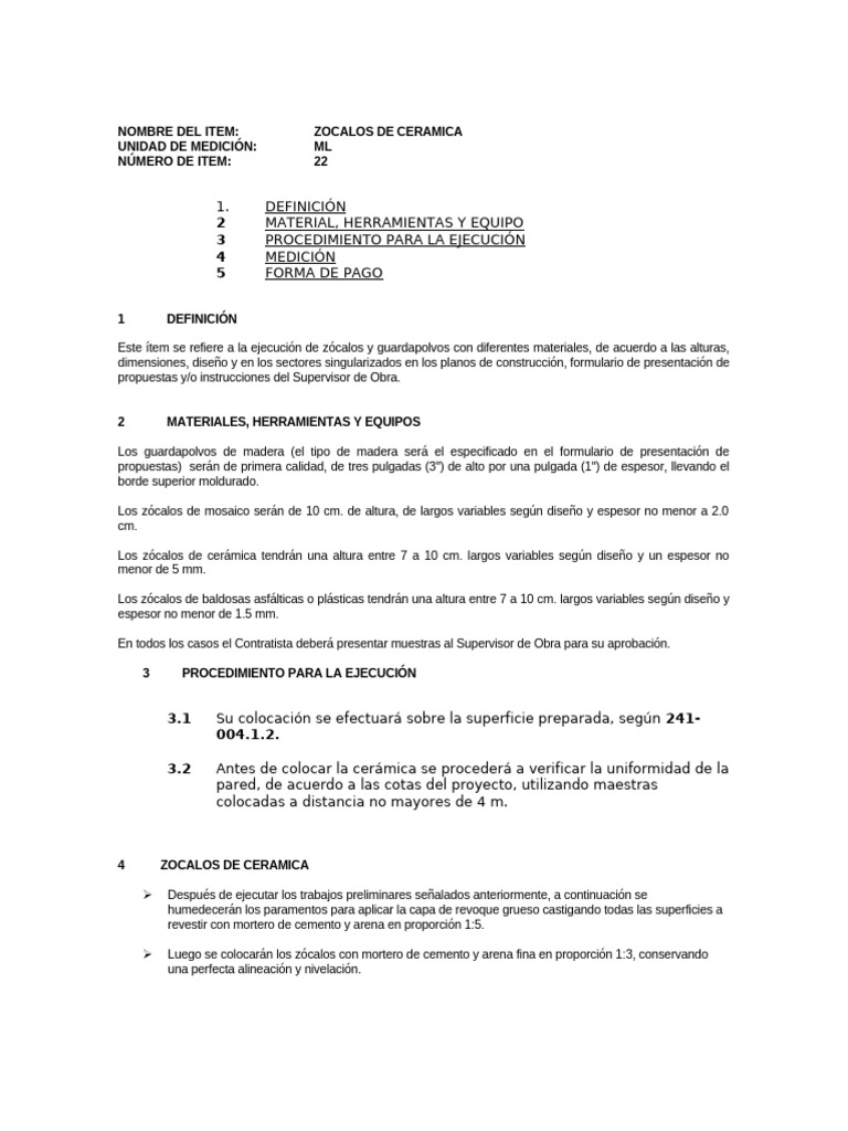 Este ítem se refiere a la ejecución de zócalos y guardapolvos con diferentes materiales, de acuerdo a las alturas,