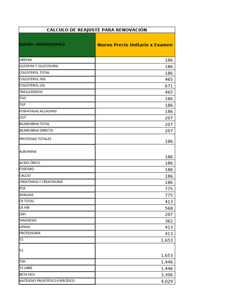 EXAMEN - INMUNOQUIMICA Nuevo Precio Unitario x Examen