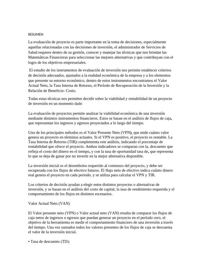 viabilidad de una inversión. Métodos como el Valor Presente Neto (VPN) y la Tasa Interna