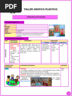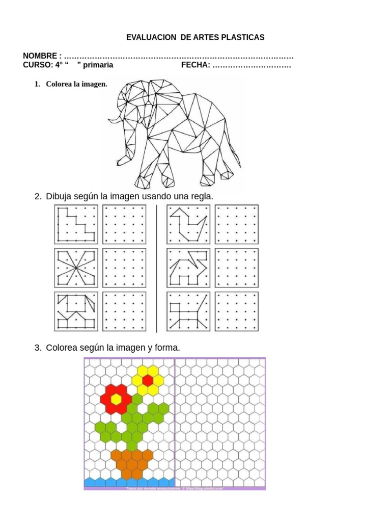 El documento es una evaluación de artes plásticas para estudiantes de 4° primaria. Incluye actividades como colorear imágenes, dibujar con regla y colorear según la forma. Se requiere que los estudiantes completen estas tareas en la fecha indicada.