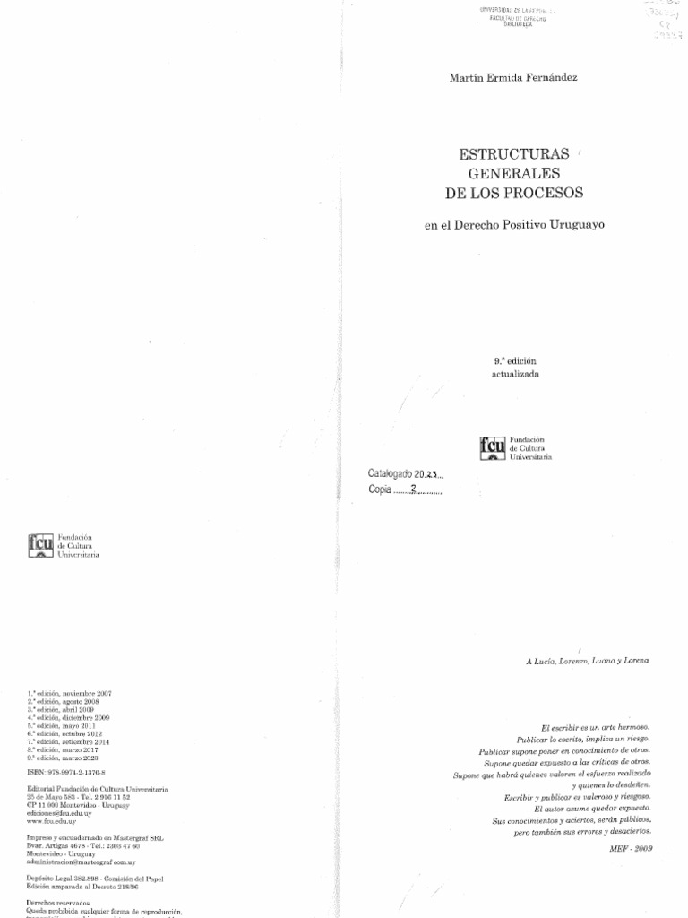 El documento es una obra de Martin Ermida Fernández que aborda las estructuras generales de los procesos en el derecho positivo uruguayo, actualizada en su novena edición. Se detalla la organización y características de diversos tipos de procesos, tanto intra como extra CCP, así como innovaciones y aspectos relevantes de la legislación vigente. La obra es un recurso valioso para estudiantes y profesionales del derecho en Uruguay.