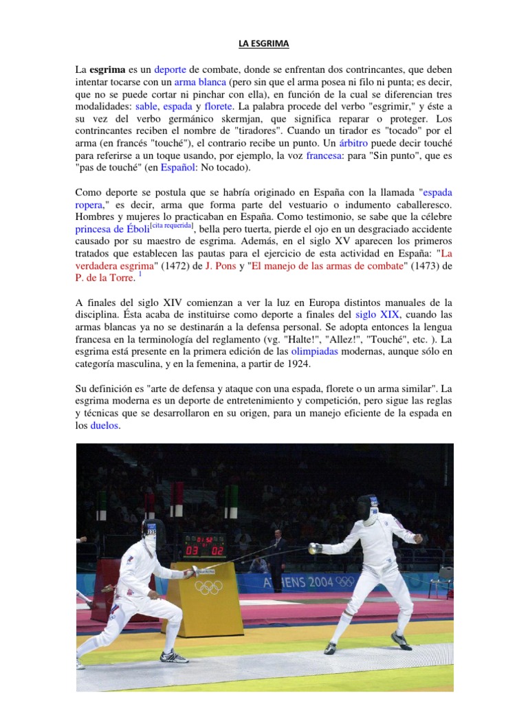La esgrima es un deporte de combate, donde se enfrentan dos contrincantes, que deben intentar tocarse con un arma blanca (pero sin que el arma posea ni filo ni punta; es decir, que no se puede cortar ni pinchar con ella), en funcin de la cual se diferencian tres modalidades: sable, espada y florete. La palabra procede del verbo "esgrimir," y ste a su vez del verbo germnico skermjan, que significa reparar o proteger. Los contrincantes reciben el nombre de "tiradores". Cuando un tirador es "tocado" por el arma (en francs "touch"), el contrario recibe un punto. Un rbitro puede decir touch para referirse a un toque usando, por ejemplo, la voz francesa: para "Sin punto", que es "pas de touch" (en Espaol: No tocado). Como deporte se postula que se habra originado en Espaa con la llamada "espada ropera," es decir, arma que forma parte del vestuario o indumento caballeresco. Hombres y mujeres lo practicaban en Espaa. Como testimonio, se sabe que la clebre princesa de boli[cita requerida], bella pero tuerta, pierde el ojo en un desgraciado accidente causado por su maestro de esgrima. Adems, en el siglo XV aparecen los primeros tratados que establecen las pautas para el ejercicio de esta actividad en Espaa: "La verdadera esgrima" (1472) de J. Pons y "El manejo de las armas de combate" (1473) de P. de la Torre. 1 A finales del siglo XIV comienzan a ver la luz en Europa distintos manuales de la disciplina. sta acaba de instituirse como deporte a finales del siglo XIX, cuando las armas blancas ya no se destinarn a la defensa personal. Se adopta entonces la lengua francesa en la terminologa del reglamento (vg. "Halte!", "Allez!", "Touch", etc. ). La esgrima est presente en la primera edicin de las olimpiadas modernas, aunque slo en categora masculina, y en la femenina, a partir de 1924. Su definicin es "arte de defensa y ataque con una espada, florete o un arma similar". La esgrima moderna es un deporte de entretenimiento y competicin, pero sigue las reglas y tcnicas que se desarrollaron en su origen, para un manejo eficiente de la espada en los duelos.