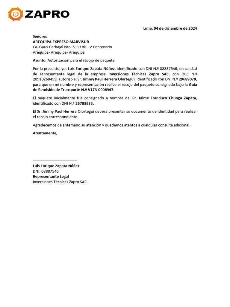20510268459, autorizo al Sr. Jimmy Paul Herrera Olortegui, identificado con DNI N.º 29689079,