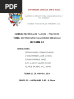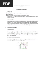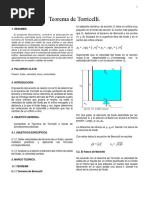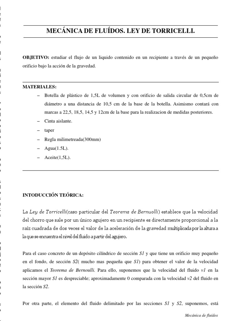 INTODUCCIN TERICA: La Ley de Torricelli(caso particular del Teorema de Bernuolli) establece que la velocidad del chorro que sale por un nico agujero en un recipiente es directamente proporcional a la raz cuadrada de dos veces el valor de la aceleracin de la gravedad multiplicada por la altura a la que se encuentra el nivel del fluido a partir del agujero.