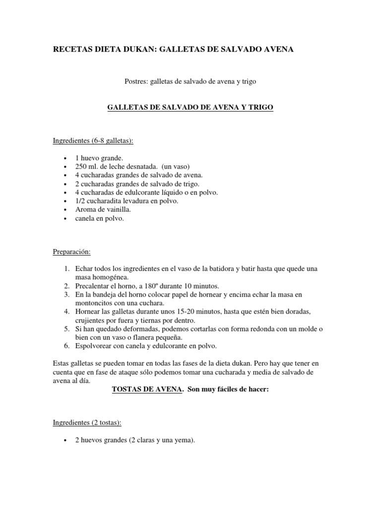Preparacin: 1. Echar todos los ingredientes en el vaso de la batidora y batir hasta que quede una masa homognea. 2. Precalentar el horno, a 180 durante 10 minutos. 3. En la bandeja del horno colocar papel de hornear y encima echar la masa en montoncitos con una cuchara. 4. Hornear las galletas durante unos 15-20 minutos, hasta que estn bien doradas, crujientes por fuera y tiernas por dentro. 5. Si han quedado deformadas, podemos cortarlas con forma redonda con un molde o bien con un vaso o flanera pequea. 6. Espolvorear con canela y edulcorante en polvo. Estas galletas se pueden tomar en todas las fases de la dieta dukan. Pero hay que tener en cuenta que en fase de ataque slo podemos tomar una cucharada y media de salvado de avena al da. TOSTAS DE AVENA. Son muy fciles de hacer: