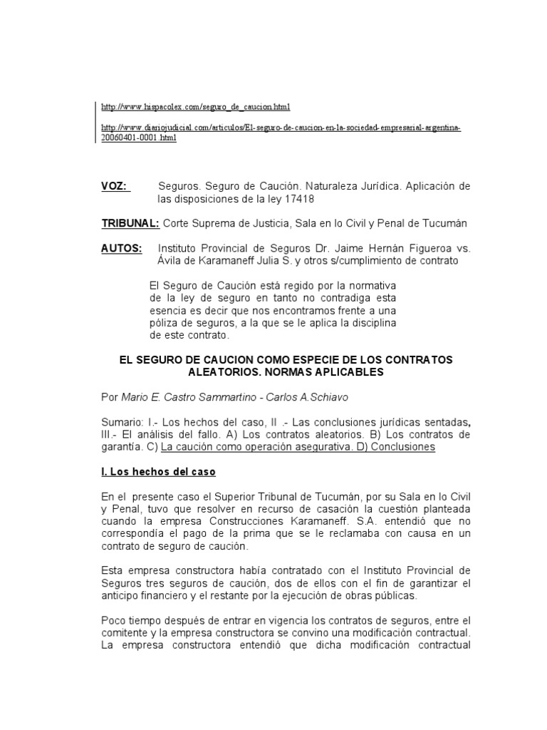 TRIBUNAL: Corte Suprema de Justicia, Sala en lo Civil y Penal de Tucumn AUTOS: Instituto Provincial de Seguros Dr. Jaime Hernn Figueroa vs. vila de Karamaneff Julia S. y otros s/cumplimiento de contrato El Seguro de Caucin est regido por la normativa de la ley de seguro en tanto no contradiga esta esencia es decir que nos encontramos frente a una pliza de seguros, a la que se le aplica la disciplina de este contrato. EL SEGURO DE CAUCION COMO ESPECIE DE LOS CONTRATOS ALEATORIOS. NORMAS APLICABLES Por Mario E. Castro Sammartino - Carlos [Link] Sumario: I.- Los hechos del caso, II .- Las conclusiones jurdicas sentadas, III.- El anlisis del fallo. A) Los contratos aleatorios. B) Los contratos de garanta. C) La caucin como operacin asegurativa. D) Conclusiones I. Los hechos del caso En el presente caso el Superior Tribunal de Tucumn, por su Sala en lo Civil y Penal, tuvo que resolver en recurso de casacin la cuestin planteada cuando la empresa Construcciones Karamaneff. S.A. entendi que no corresponda el pago de la prima que se le reclamaba con causa en un contrato de seguro de caucin. Esta empresa constructora haba contratado con el Instituto Provincial de Seguros tres seguros de caucin, dos de ellos con el fin de garantizar el anticipo financiero y el restante por la ejecucin de obras pblicas. Poco tiempo despus de entrar en vigencia los contratos de seguros, entre el comitente y la empresa constructora se convino una modificacin contractual. La empresa constructora entendi que dicha modificacin contractual