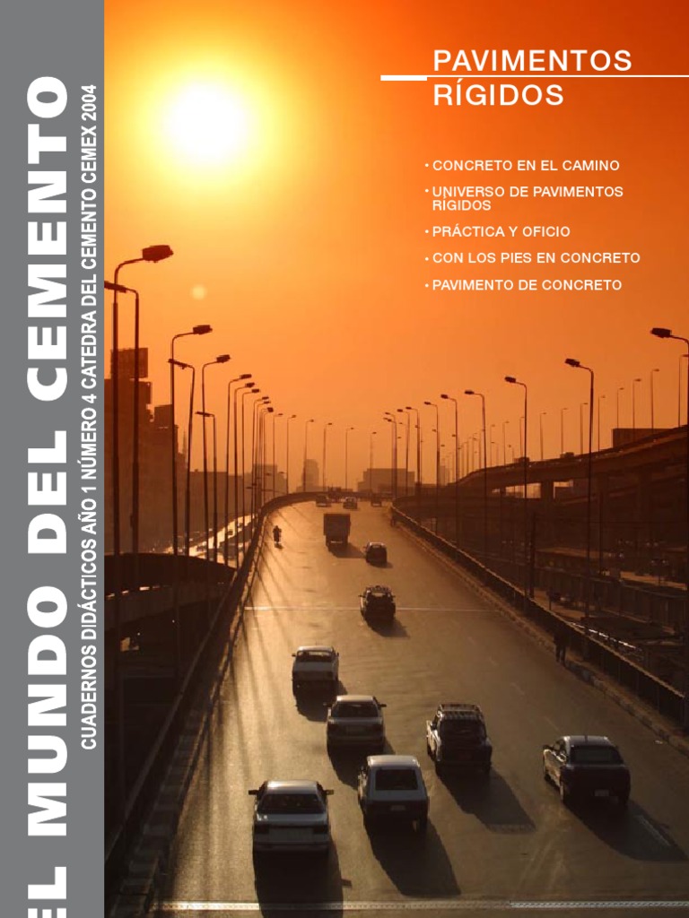 Con el advenimiento de la Revolucin Industrial en el siglo XVIII, la tarea de disear y construir caminos fue tornndose cada vez ms compleja. Primero, mediante la incursin del ferrocarril; posteriormente, con la invencin del automvil y por ltimo, con la expansin de la aviacin comercial. Dadas estas nuevas exigencias, el hombre ha requerido de tcnicas y materiales idneos para cumplir con las necesidades de las vas de comunicacin del mundo contemporneo. Gracias a las infinitas posibilidades que ofrece en cuanto a diseo y utilidad -entre distintos materiales- el concreto es el que ha permitido soluciones ms viables. En la poca actual, pavimento rgido es sinnimo de servicio y durabilidad. Tanto en los caminos rurales como en las grandes pistas para la aviacin comercial, o en la enorme diversidad de pisos y plataformas, el uso del concreto se ha extendido por casi todo el mundo proporcionando seguridad, comodidad y economa. Por ello, Ctedra del Cemento se complace en brindar al lector una mirada al fascinante mundo del diseo y la construccin de pavimentos rgidos, que mediante una sntesis de su historia, tipologa, mtodos de construccin, aplicaciones y ventajas, explica lo que es hoy el concreto para los caminos.
