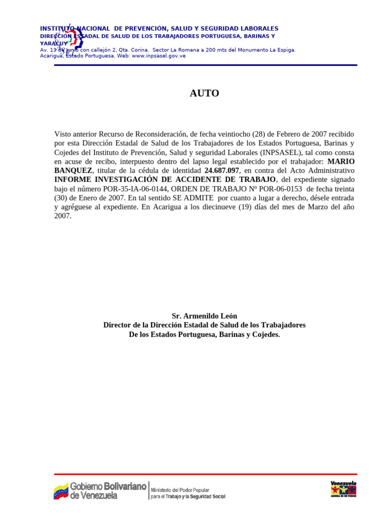 de fecha treinta (30) de Enero de 2007. Esta Dirección Estadal de Salud de los Trabajadores