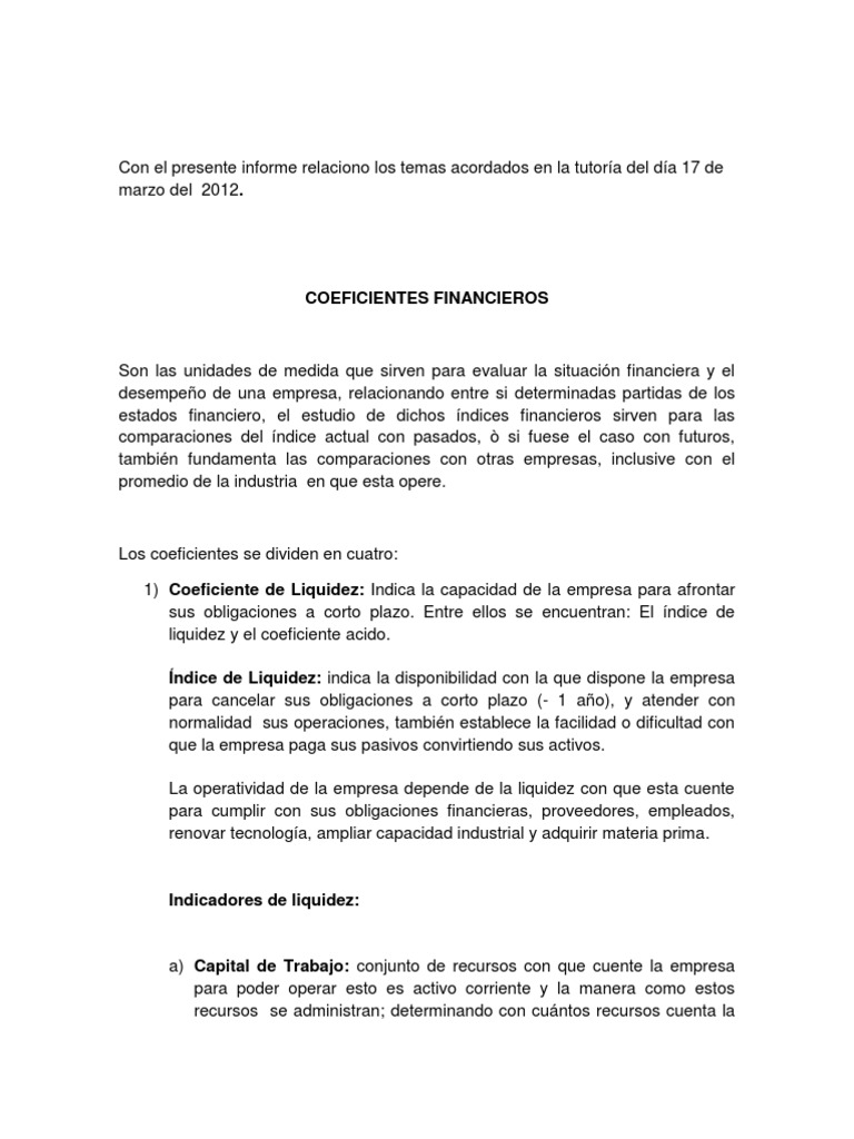 Los coeficientes se dividen en cuatro: 1) Coeficiente de Liquidez: Indica la capacidad de la empresa para afrontar sus obligaciones a corto plazo. Entre ellos se encuentran: El ndice de liquidez y el coeficiente acido. ndice de Liquidez: indica la disponibilidad con la que dispone la empresa para cancelar sus obligaciones a corto plazo (- 1 ao), y atender con normalidad sus operaciones, tambin establece la facilidad o dificultad con que la empresa paga sus pasivos convirtiendo sus activos. La operatividad de la empresa depende de la liquidez con que esta cuente para cumplir con sus obligaciones financieras, proveedores, empleados, renovar tecnologa, ampliar capacidad industrial y adquirir materia prima.