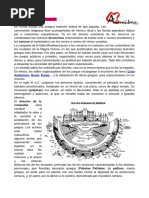En el 240 a.C. Livio Andronico, un liberto griego, representa por primera vez en Roma una pieza teatral (fabula scaenica), imitando modelos griegos. Antes de esta fecha el pblico romano ya conoca representaciones teatrales cmicas autctonas, venidas de distintas poblaciones y regiones de la Italia antigua, como los versos fesceninos, las saturae o las danzas etruscas, que siguieron perviviendo una vez introducidos en Roma los espectculos dramticos a la manera griega. semicircular; salidas (vomitoria ); gallinero (pullarium ). Los primeros teatros surgen en Roma en el s.III a.C y, en un principio, son simples tablados provisionales, con un escenario sobrio, sin teln ni decorados. Del teatro de madera se evolucionar al teatro de piedra, concebido sobre el modelo griego: gradero (cavea), fachada de fondo de gran monumentalidad (scaena); escenario (proscaenium); orquestra