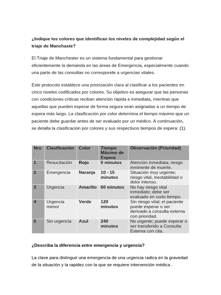 se detalla la clasificación por colores y sus respectivos tiempos de espera: (1).