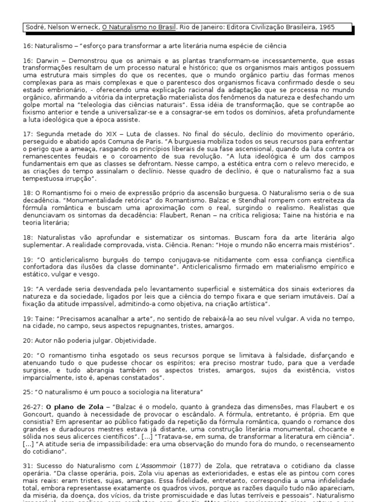 59: Abel Botelho o que mais se aproxima do modelo de Zola: 1891 Baro de Lavos, Fatal Dilema (1907), O Livro de Alda (1895) 61: Os naturalistas ortodoxos portugueses no influram na linguagem brasileira. No alcanaram xito, mesmo em Portugal: seus livros esto hoje mortos, salvos os de Abel Botelho, cuja rea de influncia restrita. Mas os debates, polmicas e questes da primeira fase tiveram eco no Brasil, foram aqui discutidos com amplitude que o meio permitia. Ea no foi um fisiologista. Influenciado por Taine, suas personagens so mais delimitadas pelo meio. Naturalismo brasileiro mais inspirado pelo modelo francs. 132: Romantismo Elaborando na fico, em torno do amor ou em torno da aventura amor e aventura que haviam sido tambm temas prediletos da literatura medieval viria a representar a luta de uma classe nova e ascensional, que chegara j a apropriar-se de mitos e de normas da classe que viria a deslocar. Do enobrecimento a uma gente Del ttulos cada vez mais numerosa, no ocidente europeu, em que o burgus imitava e adotava os padres da classe com que lutava, passaria ao enobrecimento das virtudes burguesas especficas, dispensando os ttulos. 145: Memrias de um Sargento de Milcias: alguns traos que se pode chamar naturalistas (1852); Manuel Antonio de Almeida). Tcnica de reconstituio de uma sociedade inteira, levantamento rigoroso. 147: Mas, do naturalismo, se possvel falar assim de algo que existia antes dele, Balzac utilizava a tcnica. No era um naturalista. No o podia ser, porque no estava em seu poder anteceder-se histria. O mesmo ocorreu com Manuel Antonio de Almeida, com a singular agravante, j referida, da justaposio que faz de uma tcnica de acurada observao e de reconstituio fiel com uma translao no tempo, pois se a ao se passa alguns decnios antes do momento em que apresentada. 148: Mas no eram precursores. No o poderiam se. A tcnica, por si s, no os caracteriza como naturalistas, mesmo, o que seria anti-histrico, que pudessem ser naturalistas antes do aparecimento dessa escola. Faltava-lhes, do naturalismo, o contedo, precisamente. 149: Foram as condies da sociedade europia da segunda metade do sculo XIX, na Frana particularmente, que forneceram os elementos objetivos para o advento do naturalismo. Ele no foi o mais do que a repercusso, no plano da criao literria, daquilo que as transformaes sociais e econmicas vinham exigindo, como veremos. 155: Repdio ao ortodoxismo la Zola (Araripe, Romero e Verssimo) O naturalismo no Brasil 170: O Guarani do mesmo ano da publicao em volume de Madame Bovary; Zola j comeara a srie dos Rougon-Macquart quando Taunay escreveu Inocncia. 171-172: Em 1885, Araripe Jr. est escrevendo um artigo sobre Germinal de Zola. A obra grandiosa, repleta de coisas soberanamente terrveis para colocar, em seguida, a dvida: ...resta saber se este livro til ou pernicioso. Continua: A obra de Zola, dia a dia, vai se acentuando pelo lado socialista. (...) O socialismo uma sublevao da natureza bruta, no um fato de razo, um ato de seleo consciente no corpo complexo de que fazemos parte. Zola, portanto, corporizando esse hausto doentio, que pede apenas derivativos, pelo modo sistemtico por que o fez, no procede como um artista que ama a terra de onde extrai os mrmores para sua obra escultural. (...) O romancista, moralista moderno, que aspira verdadeiramente a este nome, o fisiologista-psiclogo no pode, impunemente, desprezar os processos profilticos. Se o romance quer, hoje, um lugar entre os meios arregimentados para a educao dos povos, se a educao moderna pretende colocar-se ao par das cincias mais importantes, nada mais razovel que exigir dele que, ante de tudo, seja higinico. 172: Ora, acontecia que Zola no era higinico, para Araripe Jnior. E por qu? Qual o seu desvio? O desvio responde ele consiste em um pessimismo que forma a medula de seus livros. Zola cometia um erro fundamental, afastava-se da psicologia: Esse equilbrio poderia resultar-lhe da aceitao da doutrina psicolgica, nica que convm ao romancista sem parti pris. Citando Siciliani, Prolegmenos
