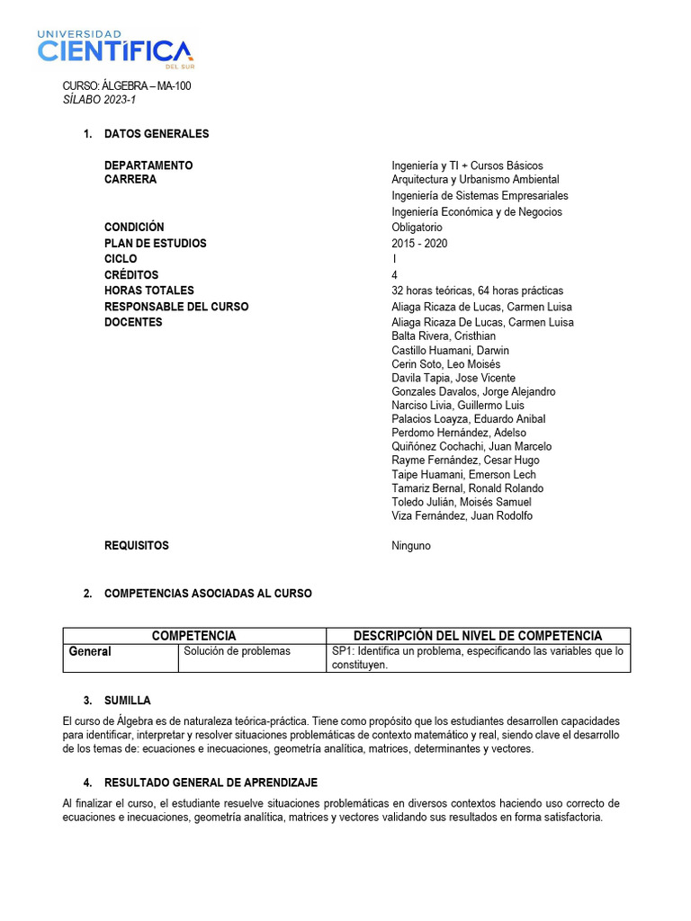 El curso de Álgebra es de naturaleza teórica-práctica. Tiene como propósito que los estudiantes desarrollen capacidades