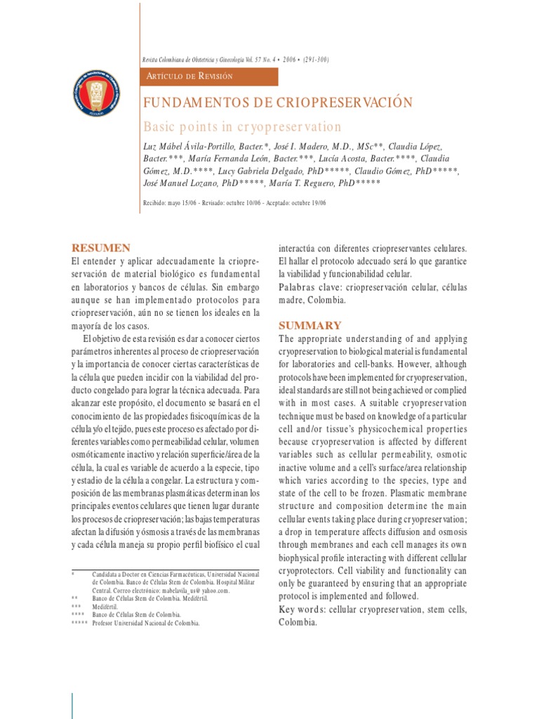 11. Meryman HT. Osmotic stress as a mechanism of freezing injury. Cryobiology 1971;8:489-500. 12. Garca JV. Criopreservadores concepto y manejo. Biol Clin Hematol 1984;6(219). 13. Porcu E. Oocyte Criopreservation. En: Gardner DK, Weissman A, Howles CM, Shoham Z (eds). Textbook of Assisted Reproductive Techniques: Laboratory and Clinical Perspectives. London, UK: Martin Dunitz Ltd; 2001. 14. Lovelock JE. The haemolysis of human red blood cells by freezing and thawing. Biochim Biophys Acta 1953;10:414-26. 15. Hunt CJ, Armitage SE, Pegg DE. Cryopreservation or umbilical cord blood: 2. Tolerance of CD34(+) cells to multimolar dimethyl sulphoxide and the effect of cooling rate on recovery after freezing and thawing. Cryobiology 2003;46:76-87. 16. Woods EJ, Lui J, Derrow CW, Smith FO, Williams DA, Critser JK. Osmometric and permeability characteristics of human placental/umbilical cord blood CD34+ cells and their application to cryopreservation. J Hematother Stem Cell Res 2000;9:161-73. 17. Devireddy RV, Swanlund DJ, Roberts KP, Pryor JL, Bischof JC. The effect of extracellular ice and cryoprotective agents on the water permeability parameters of human sperm plasma membrane during freezing. Hum Reprod 2000;15:1125-35. 18. Gilmore JA, Liu J, Woods EJ, Peter AT, Critser JK. Cryoprotective agent and temperature effects on human sperm membrane permeabilities: convergence of theoretical and empirical approaches for optimal cryopreservation methods. Hum Reprod 2000;15:335-43. 19. Hunt CJ, Armitage SE, Pegg DE. Cryopreservation or umbilical cord blood: 1. Osmotically inactive volume, hydraulic conductivity and permeability of CD34(+) cells to dimethyl sulphoxide. Cryobiology 2003;46:61-77. 20. Yang JP, Acker JP, Cabuhat M, McGann LE. Effects of incubation temperature and time after thawing on viability assessment of peripheral hematopoietic progenitor cells cryopreserved for transplantation. Bone Marow Transplant 2003:1021-6. 21. Albertini DF. The cytoskeleton as a target for chill injury in mammalian cumulus oocyte complexes. Cryobiology 1995;32:551-62.