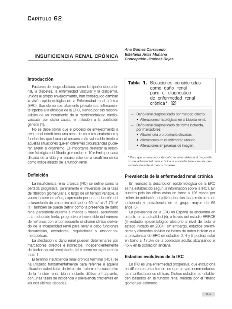 1. Soriano Cabrera S. Definicin y clasificacin de los estadios de la enfermedad renal crnica. Prevalencia. Claves para el diagnstico precoz. Factores de riesgo de enfermedad renal crnica. Nefrologa 2004; 24 (Supl 6). 2. K/DOQI clinical practice guidelines for chronic kidney disease: evaluation, classification, and stratification. Kid-