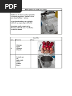 Tabla 2. Anlisis Fsico-Qumicos en pltanos almacenados a temperatura ambiente 25 C C Muestra 1 2 3 1 2 3 1 2 3 PARMETROS W inicial w final Brix pH 153.9 182.4 188.62 206.4 199.48 192.35 176.52 150.1 169.77 168.07 199.23 182.64 166.87 170.46 10.8 13.4 16.2 8 16 15.8 16.4 16 4.6 5.01 5.25 4.7 4.78 5.11 4.85 Da 2 4 6 2 4 6 2 Peso 3.8 12.63 20.55 7.17 16.84 25.48 6.06 14.19 21.32