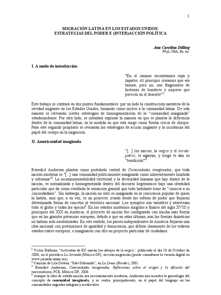 Vctor Ballinas, Activistas de EU narran los ultrajes de la migra, publicado el da 10 de Octubre de 2006, en el peridico La Jornada (Mxico DF), seccin migracin (puede consultarse la versin digital en [Link]). 2 Cancin de Lila Downs, Sale Sobrando, en La Lnea (Border), 2001. 3 Benedict Anderson, Comunidades imaginadas. Reflexiones sobre el origen y la difusin del nacionalismo, FCE, Mxico DF, 2006. 4 Aunque la idea de estado-nacin sea necesariamente moderna, Anderson nos muestra la genealoga del concepto de comunidad imaginada, y se centra, principalmente, en el papel del lenguaje en las comunidades sagradas antiguas y medievales.