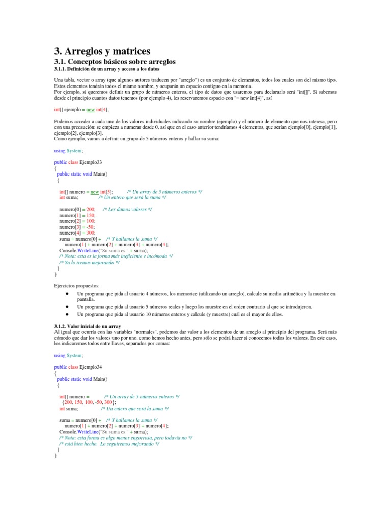 3.1.1. Definicin de un array y acceso a los datos Una tabla, vector o array (que algunos autores traducen por "arreglo") es un conjunto de elementos, todos los cuales son del mismo tipo. Estos elementos tendrn todos el mismo nombre, y ocuparn un espacio contiguo en la memoria. Por ejemplo, si queremos definir un grupo de nmeros enteros, el tipo de datos que usaremos para declararlo ser "int[]". Si sabemos desde el principio cuantos datos tenemos (por ejemplo 4), les reservaremos espacio con "= new int[4]", as int[] ejemplo = new int[4]; Podemos acceder a cada uno de los valores individuales indicando su nombre (ejemplo) y el nmero de elemento que nos interesa, pero con una precaucin: se empieza a numerar desde 0, as que en el caso anterior tendramos 4 elementos, que seran ejemplo[0], ejemplo[1], ejemplo[2], ejemplo[3]. Como ejemplo, vamos a definir un grupo de 5 nmeros enteros y hallar su suma: using System; public class Ejemplo33 { public static void Main() { /* Un array de 5 nmeros enteros */ int[] numero = new int[5]; int suma; /* Un entero que ser la suma */ numero[0] = 200; /* Les damos valores */ numero[1] = 150; numero[2] = 100; numero[3] = -50; numero[4] = 300; suma = numero[0] + /* Y hallamos la suma */ numero[1] + numero[2] + numero[3] + numero[4]; Console.WriteLine("Su suma es " + suma); /* Nota: esta es la forma ms ineficiente e incmoda */ /* Ya lo iremos mejorando */ } } Ejercicios propuestos: Un programa que pida al usuario 4 nmeros, los memorice (utilizando un arreglo), calcule su media aritmtica y la muestre en pantalla. Un programa que pida al usuario 5 nmeros reales y luego los muestre en el orden contrario al que se introdujeron. Un programa que pida al usuario 10 nmeros enteros y calcule (y muestre) cul es el mayor de ellos. 3.1.2. Valor inicial de un array Al igual que ocurra con las variables "normales", podemos dar valor a los elementos de un arreglo al principio del programa. Ser ms cmodo que dar los valores uno por uno, como hemos hecho antes, pero slo se podr hacer si conocemos todos los valores. En este caso, los indicaremos todos entre llaves, separados por comas: using System; public class Ejemplo34 { public static void Main() { int[] numero = /* Un array de 5 nmeros enteros */ {200, 150, 100, -50, 300}; int suma; /* Un entero que ser la suma */ suma = numero[0] + /* Y hallamos la suma */ numero[1] + numero[2] + numero[3] + numero[4]; Console.WriteLine("Su suma es " + suma); /* Nota: esta forma es algo menos engorrosa, pero todava no */ /* est bien hecho. Lo seguiremos mejorando */ } }