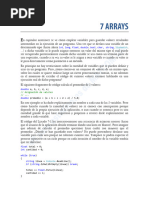 Ejercicio propuesto: Un programa almacene en un arreglo el nmero de das que tiene cada mes (supondremos que es un ao no bisiesto), pida al usuario que le indique un mes (1=enero, 12=diciembre) y muestre en pantalla el nmero de das que tiene ese mes. Un programa que almacene en una tabla el nmero de das que tiene cada mes (ao no bisiesto), pida al usuario que le indique un mes (ej. 2 para febrero) y un da (ej. El 15) y diga qu nmero de da es dentro del ao (por ejemplo, el 15 de febrero sera el da nmero 46, el 31 de diciembre sera el da 365). 3.1.3. Recorriendo los elementos de una tabla Es de esperar que exista una forma ms cmoda de acceder a varios elementos de un array, sin tener siempre que repetirlos todos, como hemos hecho en suma = numero[0] + numero[1] + numero[2] + numero[3] + numero[4]; El "truco" consistir en emplear cualquiera de las estructuras repetitivas que ya hemos visto (while, do..while, for), por ejemplo as: suma = 0; /* Valor inicial de la suma */ for (i=0; i<=4; i++) /* Y hallamos la suma repetitiva */ suma += numero[i]; El fuente completo podra ser as: using System; public class Ejemplo35 { public static void Main() { int[] numero = /* Un array de 5 nmeros enteros */ {200, 150, 100, -50, 300}; int suma; /* Un entero que ser la suma */ /* Para recorrer los elementos */ int i; suma = 0; /* Valor inicial de la suma */ for (i=0; i<5; i++) /* Y hallamos la suma repetitiva */ suma += numero[i]; Console.WriteLine("Su suma es " + suma); } } En este caso, que slo sumbamos 5 nmeros, no hemos escrito mucho menos, pero si trabajsemos con 100, 500 o 1000 nmeros, la ganancia en comodidad s que est clara. 3.1.4. Datos repetitivos introducidos por el usuario Si queremos que sea el usuario el que introduzca datos a un array, usaramos otra estructura repetitiva ("for", por ejemplo) para pedrselos: using System; public class Ejemplo36 { public static void Main() { int[] numero = new int[5]; /* Un array de 5 nmeros enteros */ int suma; /* Un entero que ser la suma */ int i; /* Para recorrer los elementos */ for (i=0; i<5; i++) /* Pedimos los datos */ { Console.Write("Introduce el dato numero " + Convert.String(i+1)); numero[i] = System.Convert.ToInt32(System.Console.ReadLine()); } suma = 0; /* Valor inicial de la suma */ for (i=0; i<5; i++) /* Y hallamos la suma repetitiva */ suma += numero[i]; Console.WriteLine("Su suma es " + suma); } }