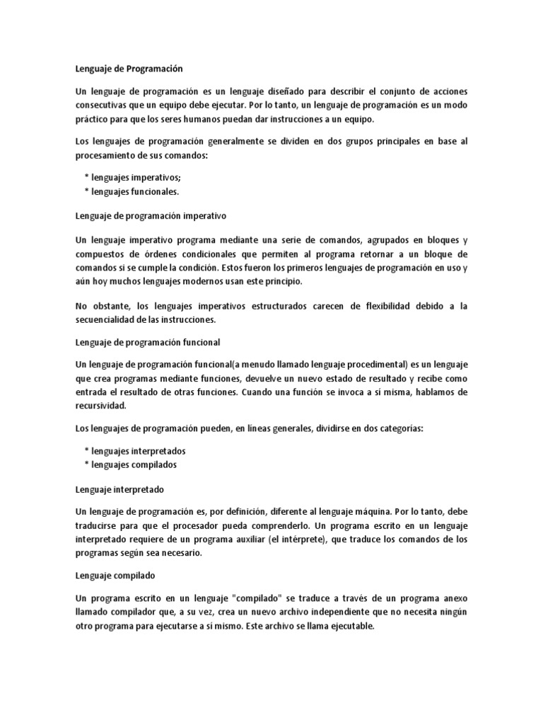 Por lo tanto, un lenguaje de programacin es un modo prctico para que los seres humanos puedan dar instrucciones a un equipo. Los lenguajes de programacin generalmente se dividen en dos grupos principales en base al procesamiento de sus comandos: * lenguajes imperativos; * lenguajes funcionales. Lenguaje de programacin imperativo Un lenguaje imperativo programa mediante una serie de comandos, agrupados en bloques y compuestos de rdenes condicionales que permiten al programa retornar a un bloque de comandos si se cumple la condicin. Estos fueron los primeros lenguajes de programacin en uso y an hoy muchos lenguajes modernos usan este principio. No obstante, los lenguajes imperativos estructurados carecen de flexibilidad debido a la secuencialidad de las instrucciones. Lenguaje de programacin funcional Un lenguaje de programacin funcional(a menudo llamado lenguaje procedimental) es un lenguaje que crea programas mediante funciones, devuelve un nuevo estado de resultado y recibe como entrada el resultado de otras funciones. Cuando una funcin se invoca a s misma, hablamos de recursividad. Los lenguajes de programacin pueden, en lneas generales, dividirse en dos categoras: * lenguajes interpretados * lenguajes compilados Lenguaje interpretado Un lenguaje de programacin es, por definicin, diferente al lenguaje mquina. Por lo tanto, debe traducirse para que el procesador pueda comprenderlo. Un programa escrito en un lenguaje interpretado requiere de un programa auxiliar (el intrprete), que traduce los comandos de los programas segn sea necesario. Lenguaje compilado Un programa escrito en un lenguaje "compilado" se traduce a travs de un programa anexo llamado compilador que, a su vez, crea un nuevo archivo independiente que no necesita ningn otro programa para ejecutarse a s mismo. Este archivo se llama ejecutable.