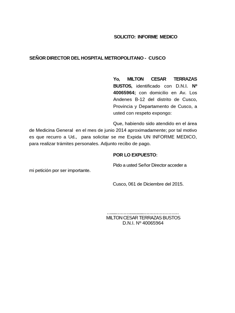 es que recurro a Ud., para solicitar se me Expida UN INFORME MEDICO,