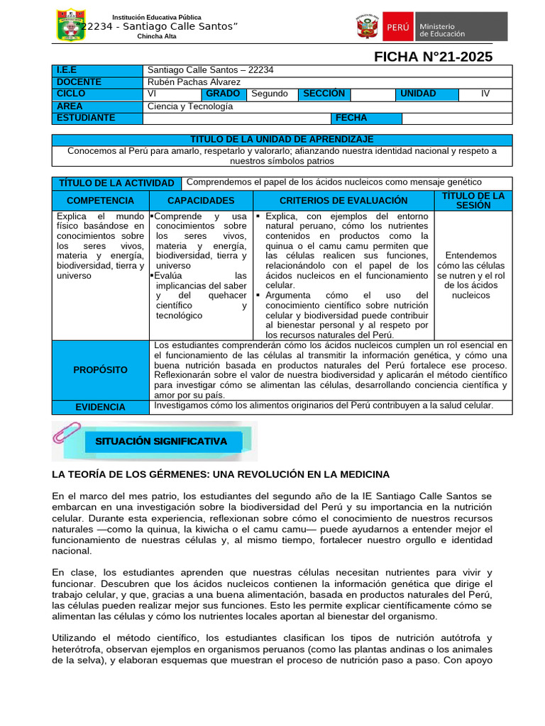 células, relacionándolo con la flora y fauna del Perú, como las raíces de la maca o los peces del