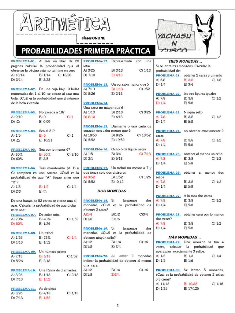 PROBLEMA-07. De color rojo. A)1/4 B)1/2 C)3/4 PROBLEMA-28. obtener cara por lo menos