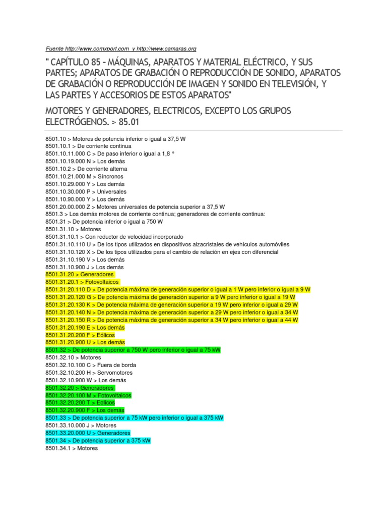 8501.10 > Motores de potencia inferior o igual a 37,5 W 8501.10.1 > De corriente continua 8501.10.11.000 C > De paso inferior o igual a 1,8 8501.10.19.000 N > Los dems 8501.10.2 > De corriente alterna 8501.10.21.000 M > Sncronos 8501.10.29.000 Y > Los dems 8501.10.30.000 P > Universales 8501.10.90.000 Y > Los dems 8501.20.00.000 Z > Motores universales de potencia superior a 37,5 W 8501.3 > Los dems motores de corriente continua; generadores de corriente continua: 8501.31 > De potencia inferior o igual a 750 W 8501.31.10 > Motores 8501.31.10.1 > Con reductor de velocidad incorporado 8501.31.10.110 U > De los tipos utilizados en dispositivos alzacristales de vehculos automviles 8501.31.10.120 X > De los tipos utilizados para el cambio de relacin en ejes con diferencial 8501.31.10.190 V > Los dems 8501.31.10.900 J > Los dems 8501.31.20 > Generadores 8501.31.20.1 > Fotovoltaicos 8501.31.20.110 D > De potencia mxima de generacin superior o igual a 1 W pero inferior o igual a 9 W 8501.31.20.120 G > De potencia mxima de generacin superior a 9 W pero inferior o igual a 19 W 8501.31.20.130 K > De potencia mxima de generacin superior a 19 W pero inferior o igual a 29 W 8501.31.20.140 N > De potencia mxima de generacin superior a 29 W pero inferior o igual a 34 W 8501.31.20.150 R > De potencia mxima de generacin superior a 34 W pero inferior o igual a 44 W 8501.31.20.190 E > Los dems 8501.31.20.200 F > Elicos 8501.31.20.900 U > Los dems 8501.32 > De potencia superior a 750 W pero inferior o igual a 75 kW 8501.32.10 > Motores 8501.32.10.100 C > Fuera de borda 8501.32.10.200 H > Servomotores 8501.32.10.900 W > Los dems 8501.32.20 > Generadores 8501.32.20.100 M > Fotovoltaicos 8501.32.20.200 T > Eolicos 8501.32.20.900 F > Los dems 8501.33 > De potencia superior a 75 kW pero inferior o igual a 375 kW 8501.33.10.000 J > Motores 8501.33.20.000 U > Generadores 8501.34 > De potencia superior a 375 kW 8501.34.1 > Motores