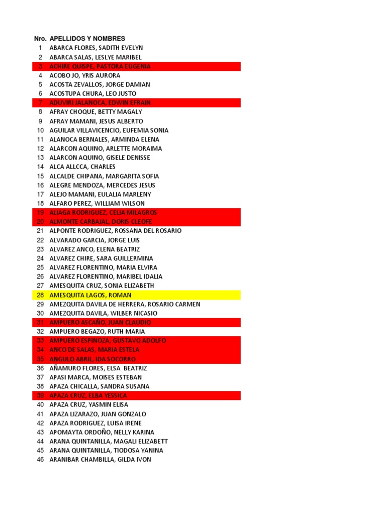 CUAYLA ESPINOZA DE MALDONAD, MIRIAN SORAYDA CUAYLA MAMANI, PEDRO OSWALDO CUAYLA MANCHEGO, ALFREDO EDGARDO CUBA CASTRO, MARIA ALEJANDRA CUELA QUISPE DE ITO, HAYDEE SONIA CUENTAS MEDINA, JULISA FLOR DE MARIA CUEVA LUZA, TIMOTEO CURO MAMANI, EDMI PAOLA CUSI NINA, ANA MARIA CUTIMBO VARGAS, KARINA LUZ CUTIPA FLORES, AYDDE JULIA CUTIPA MEDINA, MARITZA MONICA CUTIPA QUISPE, LIDIA ANA CUTIPA SALCEDO, JESUS ALFREDO CUTIPA YLLACHURA, DILMA ROSA DANCE RIOS, JESUS ANTONIO DELGADO DE ZUIGA, LILIAN FIDELA DELGADO JUAREZ, JOSE ANTONIO DELGADO SERRANO, ISMENIA TERESA DEXTRE AGUILAR, MIGUEL ANGEL DEZA ALVARADO, ANGEL ALEJANDRO DIAZ AASCO, BETTY SHERIDHAN DIAZ EGO AGUIRRE, PATRICIA ALIDA DIAZ RODRIGUEZ, MARIA NAURETH DIAZ TEJADA, GERSON GERMAN DIAZ VALDERRAMA, MONICA MILAGROS DOMINGUEZ DE SALAS, ESTELA DUARTE LIZARZABURO, JUAN FRANCISCO DUEAS GUILLEN, SECIVEL MERCEDES DUEAS RAMOS, ALFONSO ANTOLIN DURAND AAZCO, EDITH ELIZABETH DURAND LINARES, MEYBOL BENILDA ECHANDIA ARATA, YESIKA RITA EGUILUZ HERRERA, ROSIO ELIZABETH ELGUERA TAPIA, ROXANA BEATRIZ ENRIQUEZ CARTAGENA, DANIEL EDWIN ENRIQUEZ CARTAGENA, JUAN EDSON ENRIQUEZ CARTAGENA, MARINA NINOSKA ENRIQUEZ JIMENEZ, YOLANDA LUZ ESCAJADILLO VARGAS, ISMENIA YOLANDA ESPINOZA ALIAGA, DOLORES JUANA ESPINOZA AMARO, ISIDRO HERNAN ESPINOZA BENAVIDES, KARINA ELIZABETH ESPINOZA CACERES, GINA AMPARO ESPINOZA QUENAYA, GUADALUPE ALBENIA ESPINOZA ROMERO, JORGE RENE ESQUIAGOLA ROSSEL, MIRIAM BEYBI