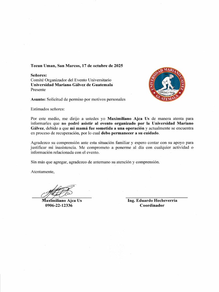 Por este medio, me dirijo a ustedes yo Maximiliano Ajca Us de manera atenta para