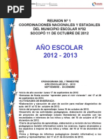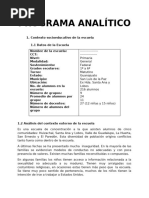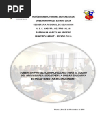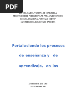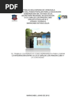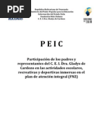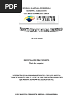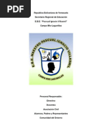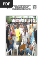 II Fase En nuestros nios, jvenes y comunidad parte de su aprendizaje se da travs de la imitacin, la cual lamentablemente atraviesa una violacin en derechos humanos, inestabilidad laboral, pobreza extrema, insensibilidad de la poblacin, venta de sustancias estupefacientes (drogas y alcohol) adyacentes a la escuela, embarazo precoz, intimidacin familiar, falta de recursos alimenticios, desorientacin sexual, malos hbitos de estudios, entre algunos hechos que flanquea al sector, lo que conlleva a varios factores que afectan directamente a nuestra institucin y sus alrededores, ya que se ve perturbada por individuos que propician daos a la infraestructura institucional y a personas, infringen la ley, hurtan, irrespetan, incumplen sus responsabilidades como representantes y padres, utilizan lenguaje y vestuario inapropiados para dirigirse a la institucin desvalorizando su integridad como ente educativo. Por consiguiente, nos vimos en la necesidad de enumerar la situacin escolar y comunitaria que la escuela atraviesa para el momento contando con la informacin proporcionada por el personal de la institucin, alumnos, representantes de los estudiantes, Vecinos y dirigentes de organizaciones e instituciones Socio-comunitarias de la Comunidad, quienes se expresaron directamente en los colectivos y mas tarde se hicieron llegar personalmente e la direccin para aportar ideas en el periodo comprendido del 17 al 20 de enero de 2012 (primera semana de clases del ao 2012). Describiendo la situacin escolar comunitaria tenemos: Ausencia de documentos legales con la memoria o resea histrica de la escuela. Actualmente existen 14 maestros contratados. Ambientacin de aulas satisfactorias. Existencia de comisiones para las diferentes actividades de los alumnos. Actualmente la escuela cuenta con 380 representantes y 450 estudiantes. Hay buena comunicacin entre la Direccin del plantel y algunos miembros de la Comunidad Educativa.