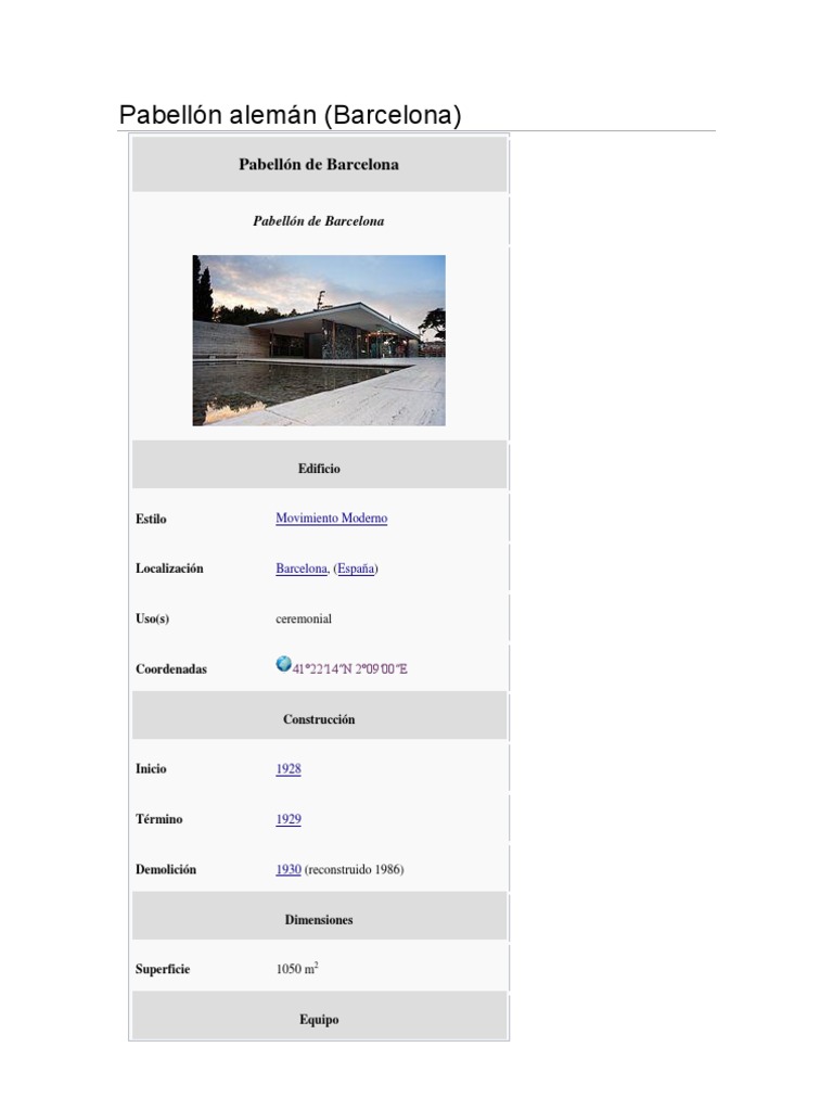 El Pabelln es una de las obras emblemticas de Ludwig Mies van der Rohe y referente clave de la arquitectura del siglo XX. El famoso Pabelln fue construido para la Exposicin Universal de Barcelona de 1929 y desmontado tras su clausura al ao siguiente. Medio siglo despus, viendo la significacin del Pabelln en trminos de Historia de la Arquitectura Contempornea, el Ayuntamiento de Barcelona con Oriol Bohigas al frente de la Delegacin de Urbanismo, decidi reconstruirlo. Ignasi de Sol -Morales, Cristian Cirici y Fernando Ramos fueron los arquitectos encargados de la investigacin, la documentacin, el diseo y la reconstruccin del Pabelln en el mismo enclave en que se construy originalmente. Estos trabajos se iniciaron en 1983 y se acabaron en 1986, ao en el que se inaugur el nuevo edificio. El edificio refleja la filosofa la simplicidad estructural, en la creacin de espacios interiores libres y en la utilizacin de materiales bsicos y elegantes, como mrmol, vidrio y acero. El pabelln expone la Silla Barcelona, icono del diseo contemporneo, y que Mies van der Rohe dise especialmente para el edificio, as como una reproduccin en bronce de la escultura Amanecer de Georg Kolbe. Los materiales Los materiales utilizados en la construccin del Pabelln: vidrio, acero y cuatro tipos distintos de mrmol (travertino romano, mrmol verde de los Alpes, mrmol verde antiguo de Grecia y nice del Atlas). De los cuatro mrmoles el que claramente marca la imagen del edificio es el mrmol travertino del cual estn hechas las paredes externas y todo el pavimento. La originalidad de Mies en el uso de los materiales no radica en la novedad de los mismos sino en el ideal de modernidad que expresaban a travs del rigor de su geometra, de la exactitud de sus piezas y de la claridad de su montaje. La silla Barcelona Mies van der Rohe dise especialmente para el pabelln la Silla Barcelona, a base de piel y tubo metlico, y se convirti en un icono del diseo moderno que se produce en la actualidad. Est considerada como un prodigio de comodidad y de plasticidad. La escultura de Georg Kolbe La escultura es una reproduccin en bronce de la escultura Amanecer de Georg Kolbe, artista contemporneo a Mies. Est colocada en un extremo de la piscina pequea y en el punto donde no solamente se refleja en el agua, sino tambin en el mrmol y en los cristales dando la sensacin que se multiplica en el espacio. Su silueta ondulante contrasta con el resto del entorno tan rectangular y geomtrico.