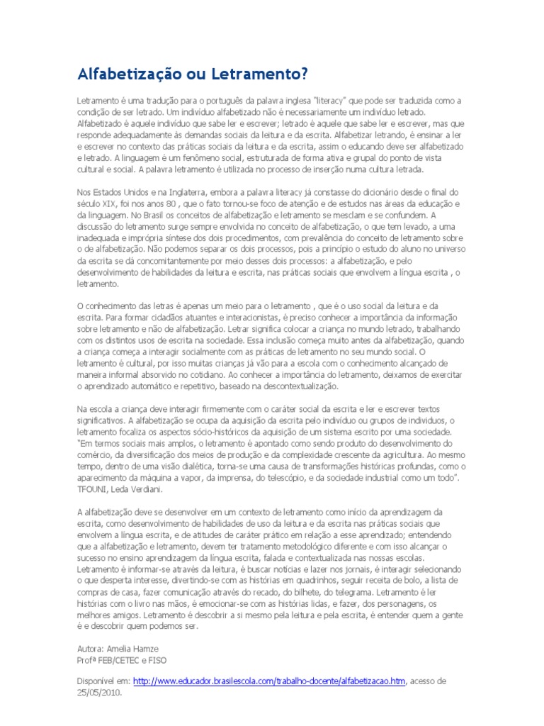 Letramento uma traduo para o portugus da palavra inglesa literacy que pode ser traduzida como a condio de ser letrado. Um indivduo alfabetizado no necessariamente um indivduo letrado. Alfabetizado aquele indivduo que sabe ler e escrever; letrado aquele que sabe ler e escrever, mas que responde adequadamente s demandas sociais da leitura e da escrita. Alfabetizar letrando, ensinar a ler e escrever no contexto das prticas sociais da leitura e da escrita, assim o educando deve ser alfabetizado e letrado. A linguagem um fenmeno social, estruturada de forma ativa e grupal do ponto de vista cultural e social. A palavra letramento utilizada no processo de insero numa cultura letrada. Nos Estados Unidos e na Inglaterra, embora a palavra literacy j constasse do dicionrio desde o final do sculo XIX, foi nos anos 80 , que o fato tornou-se foco de ateno e de estudos nas reas da educao e da linguagem. No Brasil os conceitos de alfabetizao e letramento se mesclam e se confundem. A discusso do letramento surge sempre envolvida no conceito de alfabetizao, o que tem levado, a uma inadequada e imprpria sntese dos dois procedimentos, com prevalncia do conceito de letramento sobre o de alfabetizao. No podemos separar os dois processos, pois a princpio o estudo do aluno no universo da escrita se d concomitantemente por meio desses dois processos: a alfabetizao, e pelo desenvolvimento de habilidades da leitura e escrita, nas prticas sociais que envolvem a lngua escrita , o letramento. O conhecimento das letras apenas um meio para o letramento , que o uso social da leitura e da escrita. Para formar cidados atuantes e interacionistas, preciso conhecer a importncia da informao sobre letramento e no de alfabetizao. Letrar significa colocar a criana no mundo letrado, trabalhando com os distintos usos de escrita na sociedade. Essa incluso comea muito antes da alfabetizao, quando a criana comea a interagir socialmente com as prticas de letramento no seu mundo social. O letramento cultural, por isso muitas crianas j vo para a escola com o conhecimento alcanado de maneira informal absorvido no cotidiano. Ao conhecer a importncia do letramento, deixamos de exercitar o aprendizado automtico e repetitivo, baseado na descontextualizao. Na escola a criana deve interagir firmemente com o carter social da escrita e ler e escrever textos significativos. A alfabetizao se ocupa da aquisio da escrita pelo indivduo ou grupos de individuos, o letramento focaliza os aspectos scio-histricos da aquisio de um sistema escrito por uma sociedade. Em termos sociais mais amplos, o letramento apontado como sendo produto do desenvolvimento do comrcio, da diversificao dos meios de produo e da complexidade crescente da agricultura. Ao mesmo tempo, dentro de uma viso dialtica, torna-se uma causa de transformaes histricas profundas, como o aparecimento da mquina a vapor, da imprensa, do telescpio, e da sociedade industrial como um todo. TFOUNI, Leda Verdiani. A alfabetizao deve se desenvolver em um contexto de letramento como incio da aprendizagem da escrita, como desenvolvimento de habilidades de uso da leitura e da escrita nas prticas sociais que envolvem a lngua escrita, e de atitudes de carter prtico em relao a esse aprendizado; entendendo que a alfabetizao e letramento, devem ter tratamento metodolgico diferente e com isso alcanar o sucesso no ensino aprendizagem da lngua escrita, falada e contextualizada nas nossas escolas. Letramento informar-se atravs da leitura, buscar notcias e lazer nos jornais, interagir selecionando o que desperta interesse, divertindo-se com as histrias em quadrinhos, seguir receita de bolo, a lista de compras de casa, fazer comunicao atravs do recado, do bilhete, do telegrama. Letramento ler histrias com o livro nas mos, emocionar-se com as histrias lidas, e fazer, dos personagens, os melhores amigos. Letramento descobrir a si mesmo pela leitura e pela escrita, entender quem a gente e descobrir quem podemos ser. Autora: Amelia Hamze Prof FEB/CETEC e FISO Disponvel em: http://www.educador.brasilescola.com/trabalho-docente/alfabetizacao.htm, acesso de 25/05/2010.
