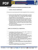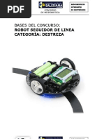 cuales presentarn diferentes recorridos y sern publicadas en el blog oficial del concurso 25 das antes del evento. Las Pistas tendrn una superficie de fondo color blanco con una lnea de color negra, la cual tendr las siguientes caractersticas: Tamao de la Lnea: 2.1 cm. (+/- 0.5) ngulos: En el recorrido de las pistas existirn ngulos cerrados no menores de 35. Discontinuidades: Las pistas tendrn discontinuidades no mayores de 4 cm. (en lneas rectas) y no mayores de 3 cm. (en curvas). Bifurcaciones: En el recorrido de las pistas habrn desvos en donde el robot tendr que decidir el camino correcto.