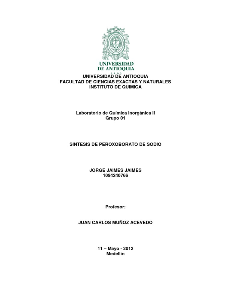 2. RESUMEN TERICO. El perborato de sodio monohidratado es obtenido principalmente como producto del perborato de sodio tetrahidratado que deshidrata tres moleculas de agua. En comparacin con perborato de sodio tetrahidratado, el perborato de sodio monohidratado tiene un contenido de oxgeno activo ms alto, en esta prctica se intenta sintetizar el perborato de sodio monohidratado utilizando como reactivo base el perxido de hidrogeno y el brax e intentar sintetizar la sal ms estable ya que la mayora de los llamados perboratos no son peroxisales verdaderas, sino peroxihidratos, es decir compuestos de adicin del agua oxigenada sobre boratos.