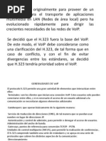 Repercusin en el comercio La Voz sobre IP est abaratando las comunicaciones internacionales y mejorando por tanto la comunicacin entre proveedores y clientes, o entre delegaciones del mismo grupo. Asimismo, la voz sobre IP se est integrando, a travs de aplicaciones especficas, en portales web. De esta forma los usuarios pueden establecer que una empresa en concreto les llame a una hora determinada, que se efectuar a travs de un operador de Voz IP normalmente. Estndar VoIP (H.323) Definido en 1996 por la UIT (Unin Internacional de Telecomunicaciones) proporciona a los diversos fabricantes una serie de normas con el fin de que puedan evolucionar en conjunto. Caractersticas principales Por su estructura el estndar proporciona las siguientes ventajas: Permite controlar el trfico de la red, por lo que se disminuyen las posibilidades de que se produzcan cadas importantes en el rendimiento. Las redes soportadas en IP presentan las siguientes ventajas adicionales: Es independiente del tipo de red fsica que lo soporta. Permite la integracin con las grandes redes de IP actuales. Es independiente del hardware utilizado. Permite ser implementado tanto en software como en hardware, con la particularidad de que el hardware supondra eliminar el impacto inicial para el usuario comn. Permite la integracin de Vdeo y TPV. Proporciona un enlace a la red de telefona tradicional. Esta telefona ha evolucionado tanto, que hasta los 800's que son nmeros no geogrficos, pueden llamar a una lnea IP. Lo que anteriormente era una central telefnica con mucha infraestructura, ahora se resume en un software instalable en un pequeo servidor con las mismas funcionalidades.