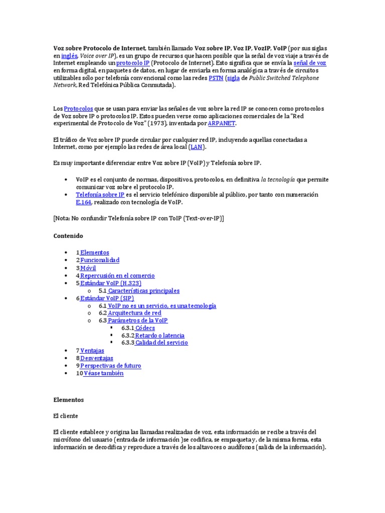 [Nota: No confundir Telefona sobre IP con ToIP (Text-over-IP)] Contenido 1 Elementos 2 Funcionalidad 3 Mvil 4 Repercusin en el comercio 5 Estndar VoIP (H.323) o 5.1 Caractersticas principales 6 Estndar VoIP (SIP) o 6.1 VoIP no es un servicio, es una tecnologa o 6.2 Arquitectura de red o 6.3 Parmetros de la VoIP 6.3.1 Cdecs 6.3.2 Retardo o latencia 6.3.3 Calidad del servicio 7 Ventajas 8 Desventajas 9 Perspectivas de futuro 10 Vase tambin