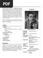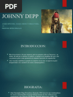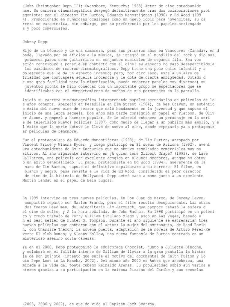 Su carrera cinematogrfica despeg definitivamente tras dos colaboraciones prot agonistas con el director Tim Burton, Eduardo Manostijeras (1990) y Ed Wood (199 4). Promocionado en numerosas ocasiones como un nuevo dolo para jovencitas, su ca rrera se caracteriza, sin embargo, por su preferencia por los papeles arriesgado s y poco comerciales. Johnny Depp Hijo de un tcnico y de una camarera, pas sus primeros aos en Vancouver (Canad), en d onde, llevado por su aficin a la msica, se integr en el mundillo del rock y dio sus primeros pasos como guitarrista en conjuntos musicales de segunda fila. Esa voc acin contribuy a ponerle en contacto con el cine: su aspecto no pas desapercibido a los cazadores de rostros cinematogrficos. Depp tiene una pose entre infantil y a dolescente que le da un aspecto ingenuo; pero, por otro lado, exhala un aire de frialdad que contrapesa aquella inocencia y le dota de cierta ambigedad. Dotado d e una gran facilidad para la mimetizacin, puede encarnar papeles muy diversos; su juventud pronto le hizo conectar con un importante grupo de espectadores que se identificaban con el comportamiento de muchos de sus personajes en la pantalla. Inici su carrera cinematogrfica interpretando papeles secundarios en pelculas de lo s aos ochenta. Apareci en Pesadilla en Elm Street (1984), de Wes Craven, un autntic o xito del nuevo cine de terror que cal hondamente en la juventud y que supuso el inicio de una larga secuela. Dos aos ms tarde consigui un papel en Platoon, de Oliv er Stone, y empez a hacerse popular. Se le ofreci entonces un personaje en la seri e de televisin Nuevos policas (1987) como medio de llegar a un pblico ms amplio, y e l xito que la serie obtuvo le llev de nuevo al cine, donde empezara ya a protagoniz ar pelculas de renombre. Fue el protagonista de Eduardo Manostijeras (1990), de Tim Burton, arropado por Vincent Price y Winona Ryder, y luego particip en El sueo de Arizona (1992), avent ura estadounidense de Emir Kusturica que no obtuvo resultados comerciales muy po sitivos. Al ao siguiente intervino en A quien teme Gilbert Grape? (1993), de Lase Hallstrom, una pelcula con excelente acogida en algunos sectores, aunque no obtuv o un xito generalizado. Su papel protagonista en Ed Wood (1994), nuevamente de la mano de Tim Burton, supuso el definitivo espaldarazo a su carrera. El filme, en blanco y negro, pasa revista a la vida de Ed Wood, considerado el peor director de cine de la historia de Hollywood. Depp actu mano a mano junto a un excelente Martin Landau en el papel de Bela Lugosi.