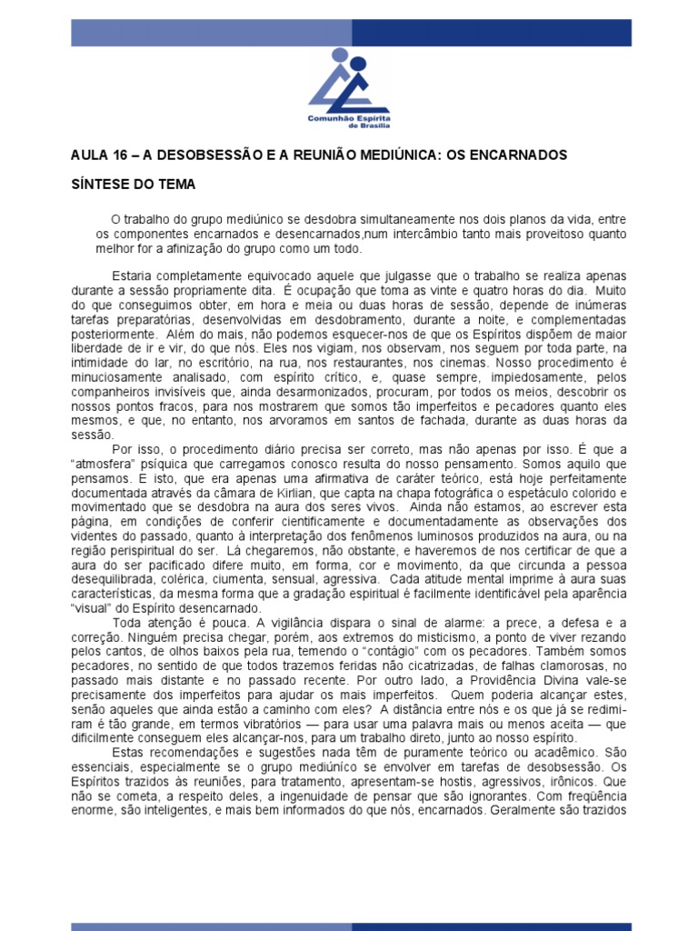 porque foram incomodados na sua atividade lamentvel. Chegam impetuosos e dispostos a fazer qualquer coisa, para continuar a proceder como acham de seu direito e at de seu dever. No desespero em que vivem mergulhados, no hesitaro em promover qualquer medida defensiva, e essa defesa, geralmente, consiste em atacar aqueles que interferem com seus planos. Cuidado, pois. Se em lugar de vigilncia e prece, lhes oferecemos o flanco desguarnecido, sintonizamo-nos com as suas vibraes agressivas e acabaremos por ser envolvidos. Da a advertncia de que o trabalho medinico, nesse campo especializado, tarefa para todas as horas do dia e da noite. As recomendaes de comportamento adequado so particularmente rgidas para o dia em que as sesses se realizam. No dia marcado para as tarefas de desobsesso escreve Andr Luiz: a) os integrantes da equipe precisam, a rigor, cultivar atitude mental digna, desde cedo. b) Resguardarem-se todos na prece, na vigilncia. Fugiremos ao envolvimento em discusses e desajustes de variada natureza. Alimentao sbria, leve. c) No custa muito, pelo menos nesse dia, abster-se de carne; e necessrio prescindir do lcool e do fumo. Sempre que possvel, durante o dia ou nas horas que precedem a reunio, um pouco de repouso fsico e mental, com relaxamento muscular e pacificao interior. Enfrentemos com disposio e coragem os empecilhos naturais que possam obstar o comparecimento reunio: um mal-estar de ltima hora, por exemplo. (Muitas vezes, principalmente no caso dos mdiuns, j se trata de aproximao de Espritos angustiados, ou colricos, que transmitem suas vibraes depressivas.). possvel que, hora da sada para a reunio, chegue uma visita inesperada, ou uma criana se ponha a chorar, inexplicavelmente agitada ou inquieta. De outras vezes, chove ou faz muito frio, ou calor excessivo, e um pensamento de comodismo e preguia nos segreda a palavra de desnimo. Muitos obreiros promissores tm sido afastados de tarefas redentoras por pequeninos incidentes como estes, que se vo somando, at neutraliz-los de todo. Nem percebem que os companheiros das sombras souberam tirar bom partido dos acontecimentos, ou at mesmo os provocaram, como no caso do sbito mal-estar prprio ou de um membro da famlia. No dia seguinte, ou horas depois, o mal-estar ter passado, como por encanto, mas o trabalho das trevas j est feito: um obreiro a menos na seara, pelo menos naquele dia. A grande vitria comea com as pequenas escaramuas. Cuidado, ateno, serenidade, firmeza. OS MDIUNS O captulo 32, de O Livro dos Mdiuns, intitula-se Vocabulrio Esprita, e sugere a seguinte definio: Mdium (Do latim medium, meio, intermedirio). Pessoa que pode servir de intermedirio entre os Espritos e os homens. Revelando o cuidado e o extraordinrio poder de sntese que Kardec sempre demonstra, essa definio um primor de clareza. Vemos, por ela, que o mdium uma pessoa, isto , um ser encarnado, sujeito, por conseguinte, s imperfeies e mazelas que nos afligem a todos e, portanto, to propenso queda quanto qualquer um de ns, ou talvez mais ainda, porque sua capacidade de sintonizar-se com os desencarnados o expe a um grau mais elevado de influenciao. Sabemos, por outro lado, do aprendizado esprita, que a mediunidade, longe de ser a marca da nossa grandeza espiritual, , ao contrrio, o indcio de renitentes imperfeies. Representa, por certo, uma faculdade, uma capacidade concedida pelos poderes que nos assistem, mas no no sentido humano, como se o mdium fosse colocado parte e acima dos vis mortais, como seres de