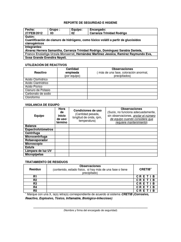 REPORTE DE SEGURIDAD E HIGIENE Fecha: Grupo : Equipo: Encargado: 27/FEB/2012 03 02 Carranza Trinidad Rodrigo Guin: Cuantificacin de cianuro de hidrgeno,