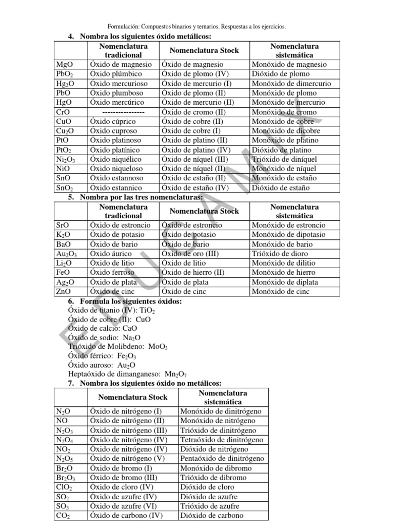 Formulacin: Compuestos binarios y ternarios. Respuestas a los ejercicios.