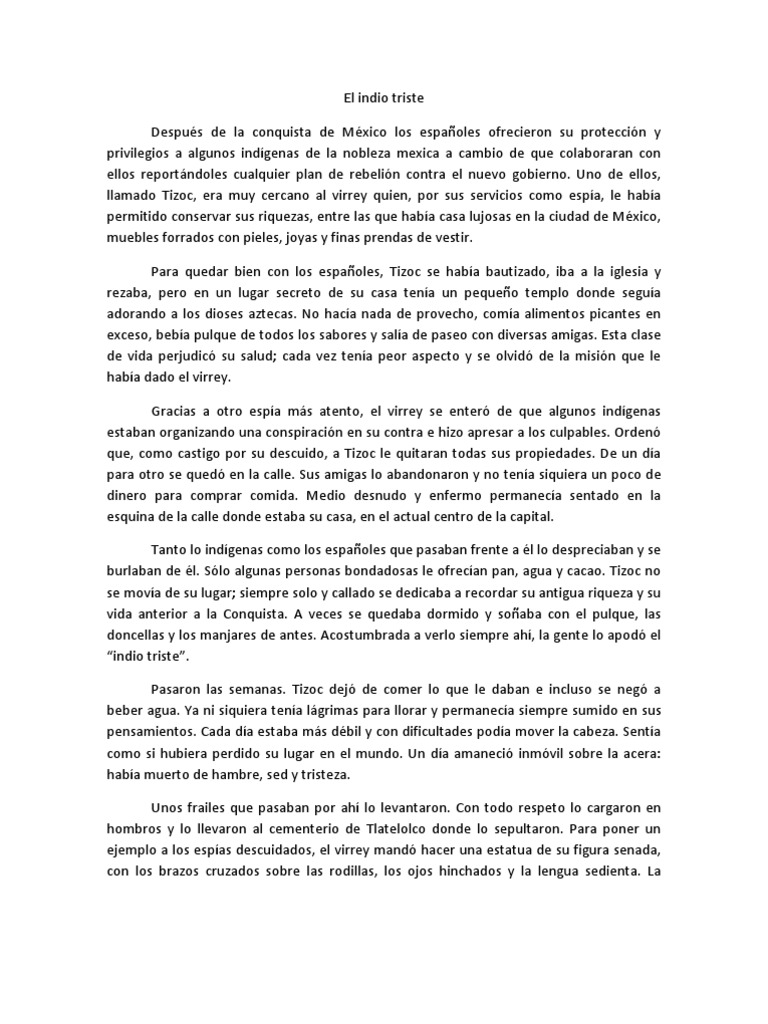 de que colaboraran con ellos reportndoles cualquier plan de rebelin contra el nuevo gobierno. Uno de ellos, llamado Tizoc, era muy cercano al virrey quien, por sus servicios como espa, le haba permitido conservar sus riquezas, entre las que haba casa lujosas en la ciudad de Mxico, muebles forrados con pieles, joyas y finas prendas de vestir. Para quedar bien con los espaoles, Tizoc se haba bautizado, iba a la iglesia y rezaba, pero en un lugar secreto de su casa tena un pequeo templo donde segua adorando a los dioses aztecas. No haca nada de provecho, coma alimentos picantes en exceso, beba pulque de todos los sabores y sala de paseo con diversas amigas. Esta clase de vida perjudic su salud; cada vez tena peor aspecto y se olvid de la misin que le haba dado el virrey. Gracias a otro espa ms atento, el virrey se enter de que algunos indgenas estaban organizando una conspiracin en su contra e hizo apresar a los culpables. Orden que, como castigo por su descuido, a Tizoc le quitaran todas sus propiedades. De un da para otro se qued en la calle. Sus amigas lo abandonaron y no tena siquiera un poco de dinero para comprar comida. Medio desnudo y enfermo permaneca sentado en la esquina de la calle donde estaba su casa, en el actual centro de la capital. Tanto lo indgenas como los espaoles que pasaban frente a l lo despreciaban y se burlaban de l. Slo algunas personas bondadosas le ofrecan pan, agua y cacao. Tizoc no se mova de su lugar; siempre solo y callado se dedicaba a recordar su antigua riqueza y su vida anterior a la Conquista. A veces se quedaba dormido y soaba con el pulque, las doncellas y los manjares de antes. Acostumbrada a verlo siempre ah, la gente lo apod el indio triste. Pasaron las semanas. Tizoc dej de comer lo que le daban e incluso se neg a beber agua. Ya ni siquiera tena lgrimas para llorar y permaneca siempre sumido en sus pensamientos. Cada da estaba ms dbil y con dificultades poda mover la cabeza. Senta como si hubiera perdido su lugar en el mundo. Un da amaneci inmvil sobre la acera: haba muerto de hambre, sed y tristeza. Unos frailes que pasaban por ah lo levantaron. Con todo respeto lo cargaron en hombros y lo llevaron al cementerio de Tlatelolco donde lo sepultaron. Para poner un ejemplo a los espas descuidados, el virrey mand hacer una estatua de su figura senada, con los brazos cruzados sobre las rodillas, los ojos hinchados y la lengua sedienta. La