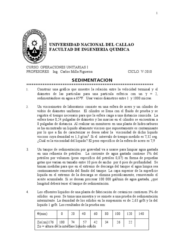 Un viscosmetro de laboratorio consiste en una esfera de acero y un cilindro de vidrio de dimetro uniforme. El cilindro se llena con el fluido de prueba y se registra el tiempo necesario para que la esfera caiga a una distancia conocida. La esfera tiene 0,24 pulgadas de dimetro y las marcas en el cilindro se encuentran a 8 pulgadas de distancia. Al realizar un monitoreo en una planta de hidrocarburos se ha encontrado un liquido altamente viscoso que supuestamente es contaminante por lo que a fin de caracterizar se desea saber la viscosidad de dicho liquido viscoso cuya densidad es 1,3 g/cm3. Si el intervalo de tiempo medido es 7,32 seg. Cul es la viscosidad del liquido? El peso especfico de la esfera de acero es 7,9 Un tanque de sedimentacin por gravedad va a usarse para limpiar agua gastada en una refinera de petrleo. La corriente de agua gastada contiene 1% del petrleo por volumen (peso especfico del petrleo 0,87) en forma de pequeas gotas que varan en tamao entre 10 pies de ancho por 6 pies de profundidad. Se toman medidas para que en el extremo de descarga del tanque el agua limpia sea continuamente removida del fondo del tanque. La capa superior de la superficie lquida en el extremo de la descarga se elimina peridicamente, removiendo el aceite acumulado. Si se desean procesar 100 000 gal/min de agua gastada, qu longitud deber tener el tanque de sedimentacin. Los efluentes lquidos de una planta de fabricacin de cermicos contienen 3% de slidos en peso. Se toma una muestra y se somete a una prueba de sedimentacin intermitente. La densidad de los slidos en la suspensin es de 2,63 gr/lt y la del lquido 1 gr/lt. Los resultados de la prueba son: (min) 0 20 40 60 80 34 100 26 120 22 140