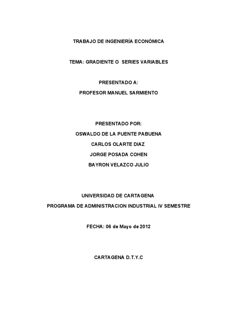 La toma de decisiones en ingeniera requiere tener en cuenta variables de tipo tcnico, variables econmico-financieras y de modelos econmicos. En el presente trabajo se explica un modelo econmico llamado gradiente o tambin conocida como series variables y si se profundizan los conocimientos de su forma de manejarlo y calcularlo, se convertir en una excelente herramienta para una toma de decisiones segura en los negocios ya sea de amortizacin (crdito) o de capitalizacin (ahorro).