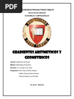 Gradientes son anualidades o serie de pagos peridicos, en los cuales cada pago es igual al anterior ms una cantidad; esta cantidad puede ser constante o proporcional al pago inmediatamente anterior. El monto en que vara cada pago determina la clase de gradiente: Si la cantidad es constante el gradiente es aritmtico (por ejemplo cada pago aumenta o disminuye en $500 mensuales sin importar su monto). Si la cantidad en que vara el pago es proporcional al pago inmediatamente anterior el gradiente es geomtrico (por ejemplo cada pago aumenta o disminuye en 3% mensual) La aplicacin de gradientes en los negocios supone el empleo de dos conceptos dependiendo del tipo de negocios: Negocios con amortizacin (crdito), tipo en el que partimos de un valor actual, con cuotas crecientes pagaderas al vencimiento y con saldo cero al pago de la ltima cuota. Negocios de capitalizacin (ahorro), tipo en el que partimos de un valor actual cero con cuotas crecientes acumulables hasta alcanzar al final del plazo un valor futuro deseado. CLASIFICASION DE GRADIENTES
