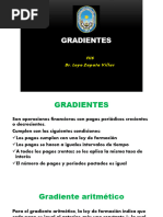 Gradiente a una serie de flujos de caja (ingresos o desembolsos) peridicos que poseen una ley de formacin, que hace referencia a que los flujos de caja pueden incrementar o disminuir, con relacin al flujo de caja anterior, en una cantidad constante en pesos o en un porcentaje. Para que una serie de flujos de caja se consideren un gradiente, deben cumplir las siguientes condiciones: Los flujos de caja deben tener una ley de formacin. Los flujos de caja deben ser peridicos Los flujos de caja deben tener un valor un valor presente y futuro equivalente. La aplicacin de gradientes en los negocios supone el empleo de dos conceptos dependiendo del tipo de negocios: Negocios con amortizacin (crdito), tipo en el que partimos de un valor actual, con cuotas crecientes pagaderas al vencimiento y con saldo cero al pago de la ltima cuota. Negocios de capitalizacin (ahorro), tipo en el que partimos de un valor actual cero con cuotas crecientes acumulables hasta alcanzar al final del plazo un valor futuro deseado