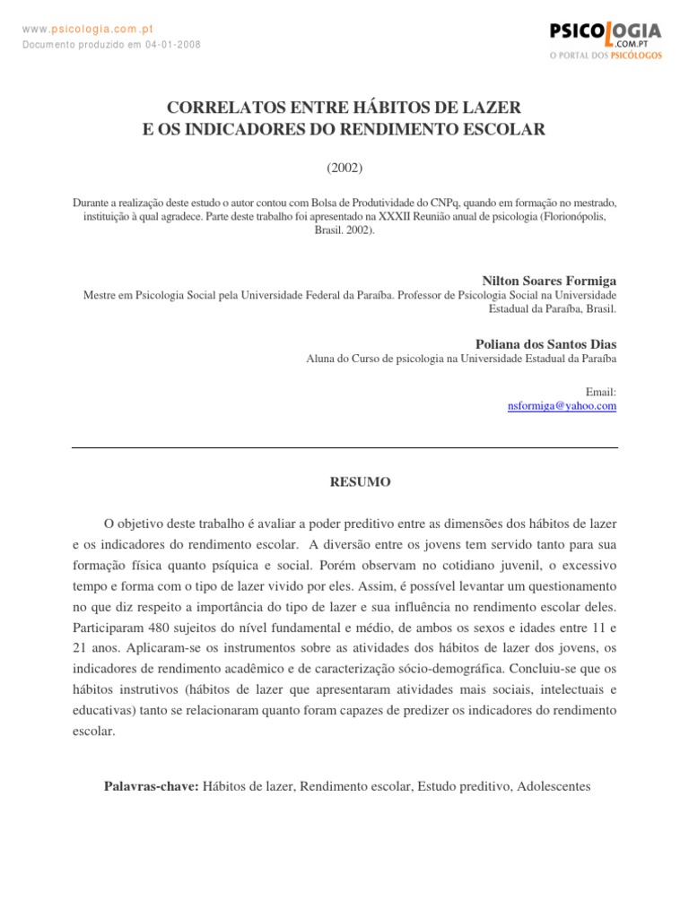 No de hoje que se tm buscado solues para explicar o xito escolar em jovens a partir da elaborao de mtodos, das teorias pedaggicas ou psicolgicas; porm, o objetivo parece ser um s: formar e capacitar o aluno para alcanar um nvel scio-cultural mais qualificado, bem como, orienta-lo na soluo de problemas formais ou informais apresentados em seu cotidiano. Apesar desse objetivo to claro, acompanha-se a cada dia no desenvolvimento scio-educacional desses jovens da educao bsica a superior o descaso e um certo aborrecimento que alguns tm a respeito da formao e assimilao do conhecimento e at do alfabetismo intelectual e cientfico. Parece ento, que tais causas so mais complexas do que se pensa, pois no se deve apenas a dimenso individual, mas social e psicossocial, as quais so capazes de influenciar na predio do fenmeno do xito e qualidade do comportamento escolar (Formiga, Gouveia, Andrade & Omar, 2002; Omar, Delgado & Formiga, 2002). Para isso, algumas direes concretas vm sendo indicadas: a forma e qualificao do processo avaliao (Andr, 1997; Perrenoud, 1999), a valorizao da criatividade frente velocidade e diversidade das informaes surgidas na sociedade atual (Gardner, 1999), a predio de indicadores do rendimento escolar a partir dos valores humanos (Formiga, Queiroga & Gouveia, 2001), bem como, a interveno nos valores para mudana de comportamento social e educacional (Prez-Serrano, 2002; Ros, Grad & Martinez-Snchez, 1996), entre outros. Assim, muitas so as especulaes em torno da descoberta do que est por traz da dificuldade de instruir-se e entre estas, possvel hipotetizar aspectos sociais como um dos seus maiores determinantes (Chaves, 1992), por outro lado, parece ser muito saliente e consistente a nfase numa perspectiva psicossocial (Ovejero, 1998), a qual vem direcionando, frente a tal problema, perspectivas multidimensionais. Contudo, um dos construtos que nenhum estudo emprico tem se encontrado no Brasil, quanto a influncia dos hbitos de lazer no xito escolar, o qual possa considerar alguns indicadores mais conhecidos e de fcil observao em relao ao rendimento escolar. Teoricamente, alguns estudos tem sido conhecido sobre as atividades de lazer no Brasil (ver Marcelino, 2000a; 2000b; Leite, 1995; Dumazier, 1974/1999; Werneck, 2000), mas, em busca recente com as seguintes combinaes de palavras-chave: Rendimento escolar e lazer ou adolescentes, lazer e xito acadmico ou diverso, rendimento escolar, indicador do rendimento escolar, lazer e adolescentes (Index Psi, 2003; Scielo, 2003), no foi encontrado trabalhos neste aspecto. Com isso, viu-se a necessidade de avaliar relao as variveis em questo: rendimento escolar e hbitos de lazer.
