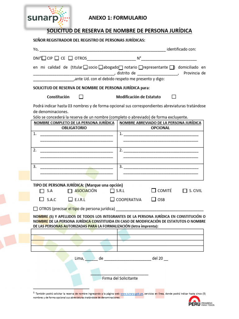 También podrá solicitar la reserva de nombre ingresando a la página web www.sunarp.gob.pe, servicios en línea, donde podrá indicar hasta cinco (5)