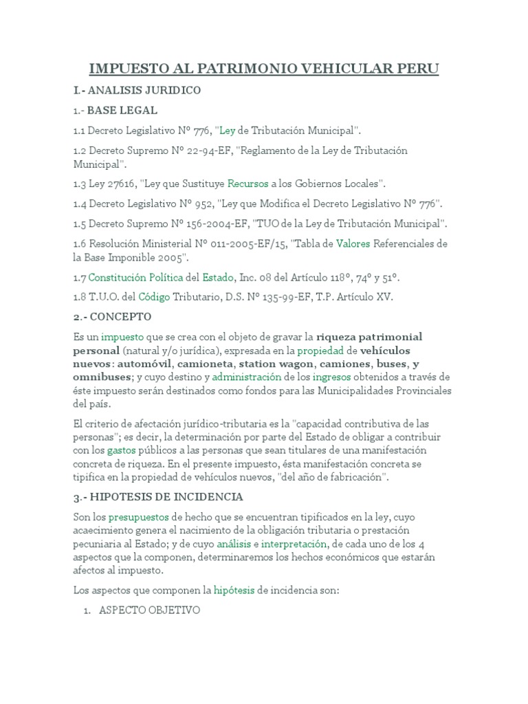 I.- ANALISIS JURIDICO 1.- BASE LEGAL 1.1 Decreto Legislativo N 776, "Ley de Tributacin Municipal". 1.2 Decreto Supremo N 22-94-EF, "Reglamento de la Ley de Tributacin Municipal". 1.3 Ley 27616, "Ley que Sustituye Recursos a los Gobiernos Locales". 1.4 Decreto Legislativo N 952, "Ley que Modifica el Decreto Legislativo N 776". 1.5 Decreto Supremo N 156-2004-EF, "TUO de la Ley de Tributacin Municipal". 1.6 Resolucin Ministerial N 011-2005-EF/15, "Tabla de Valores Referenciales de la Base Imponible 2005". 1.7 Constitucin Poltica del Estado, Inc. 08 del Artculo 118, 74 y 51. 1.8 T.U.O. del Cdigo Tributario, D.S. N 135-99-EF, T.P. Artculo XV. 2.- CONCEPTO Es un impuesto que se crea con el objeto de gravar la riqueza patrimonial personal (natural y/o jurdica), expresada en la propiedad de vehculos nuevos: automvil, camioneta, station wagon, camiones, buses, y omnibuses; y cuyo destino y administracin de los ingresos obtenidos a travs de ste impuesto sern destinados como fondos para las Municipalidades Provinciales del pas. El criterio de afectacin jurdico-tributaria es la "capacidad contributiva de las personas"; es decir, la determinacin por parte del Estado de obligar a contribuir con los gastos pblicos a las personas que sean titulares de una manifestacin concreta de riqueza. En el presente impuesto, sta manifestacin concreta se tipifica en la propiedad de vehculos nuevos, "del ao de fabricacin". 3.- HIPOTESIS DE INCIDENCIA Son los presupuestos de hecho que se encuentran tipificados en la ley, cuyo acaecimiento genera el nacimiento de la obligacin tributaria o prestacin pecuniaria al Estado; y de cuyo anlisis e interpretacin, de cada uno de los 4 aspectos que la componen, determinaremos los hechos econmicos que estarn afectos al impuesto. Los aspectos que componen la hiptesis de incidencia son: 1. ASPECTO OBJETIVO