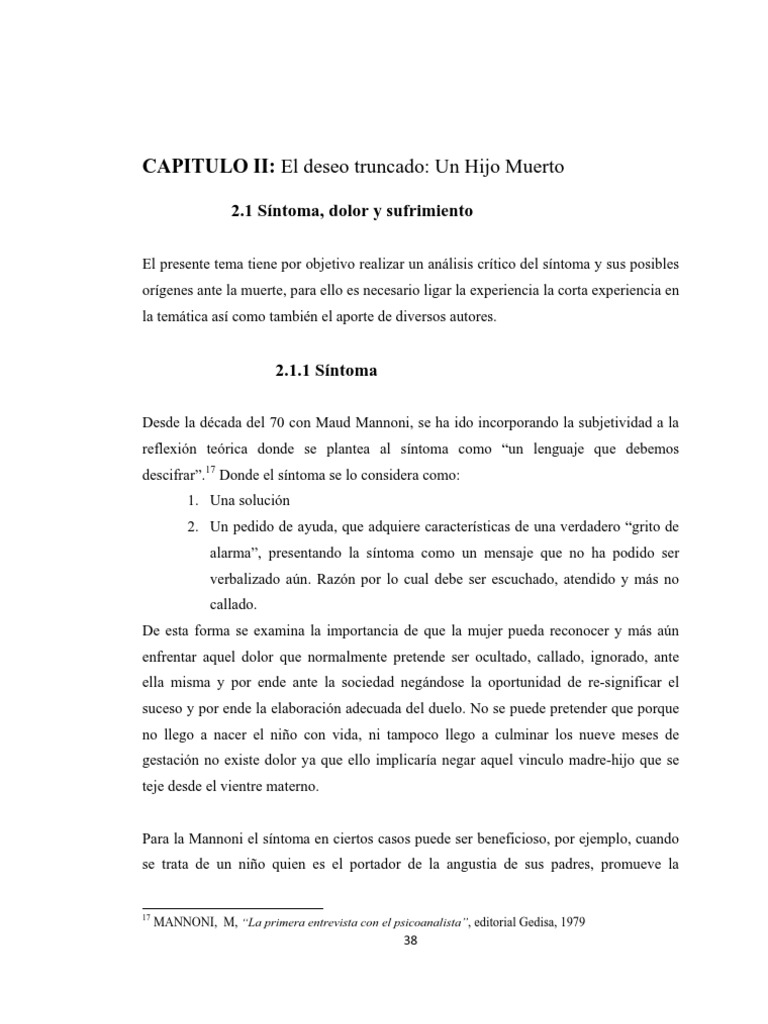 Desde la dcada del 70 con Maud Mannoni, se ha ido incorporando la subjetividad a la reflexin terica donde se plantea al sntoma como un lenguaje que debemos descifrar.17 Donde el sntoma se lo considera como: 1. Una solucin 2. Un pedido de ayuda, que adquiere caractersticas de una verdadero grito de alarma, presentando la sntoma como un mensaje que no ha podido ser verbalizado an. Razn por lo cual debe ser escuchado, atendido y ms no callado. De esta forma se examina la importancia de que la mujer pueda reconocer y ms an enfrentar aquel dolor que normalmente pretende ser ocultado, callado, ignorado, ante ella misma y por ende ante la sociedad negndose la oportunidad de re-significar el suceso y por ende la elaboracin adecuada del duelo. No se puede pretender que porque no llego a nacer el nio con vida, ni tampoco llego a culminar los nueve meses de gestacin no existe dolor ya que ello implicara negar aquel vinculo madre-hijo que se teje desde el vientre materno. Para la Mannoni el sntoma en ciertos casos puede ser beneficioso, por ejemplo, cuando se trata de un nio quien es el portador de la angustia de sus padres, promueve la